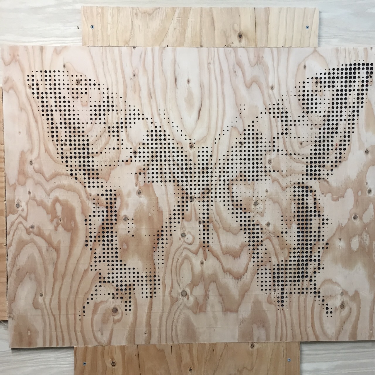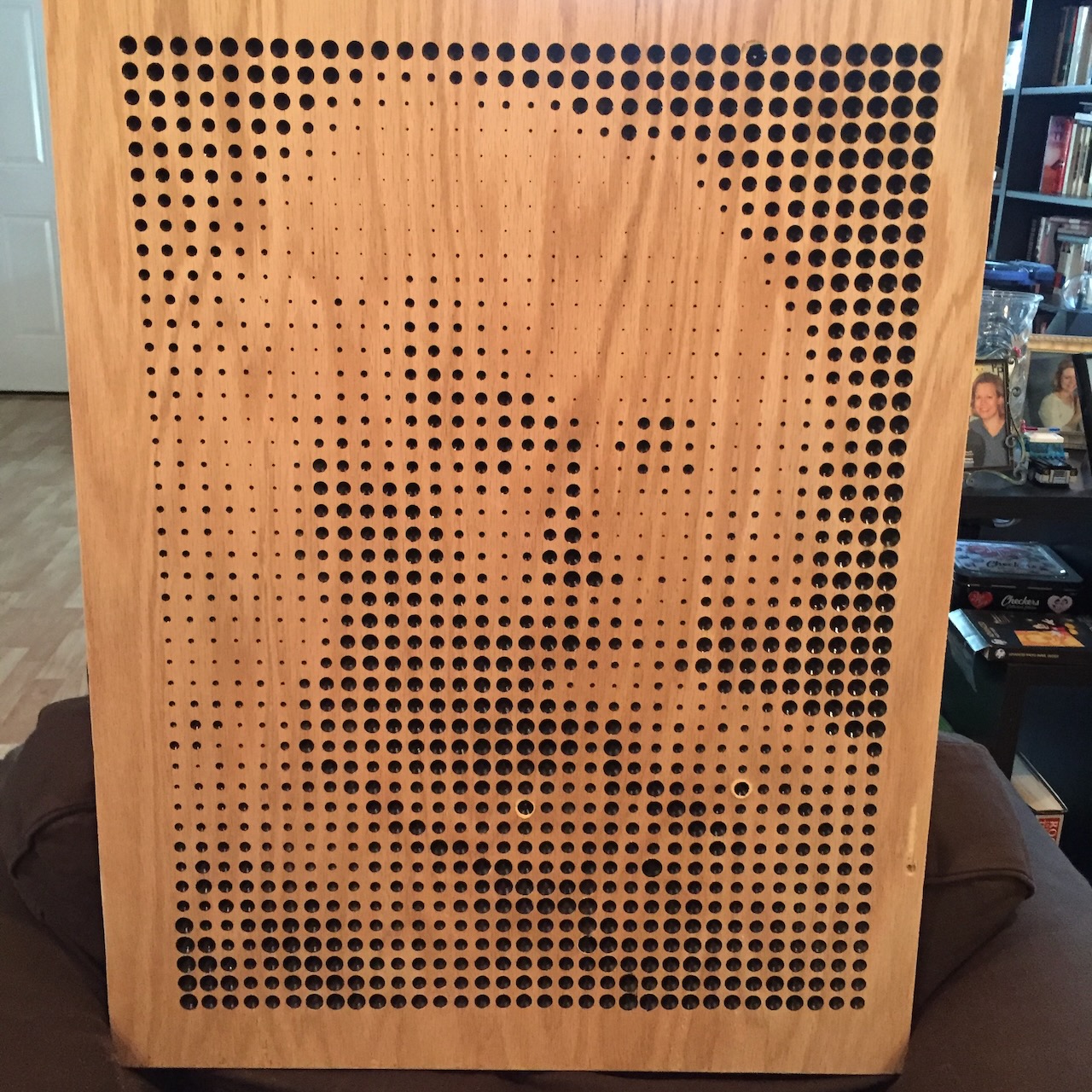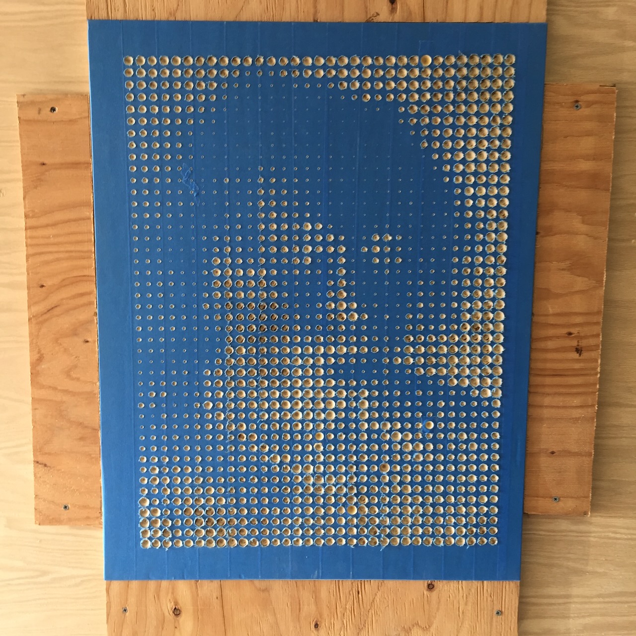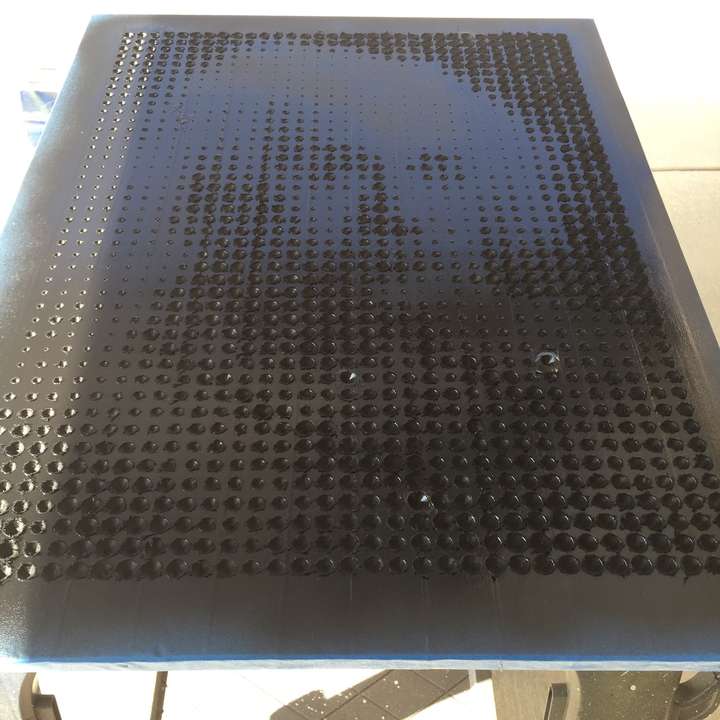 Ok, if you can make a halftone image on a 3D printer, why not on a CNC machine? These were proof of concept tests. (In case you can't tell, the top portrait is of Albert Einstein.) I used a conical bit, and made the depth correspond to the blackness of the pixel. I would improve on this method later when I made a family portrait halftone with square pixels.
